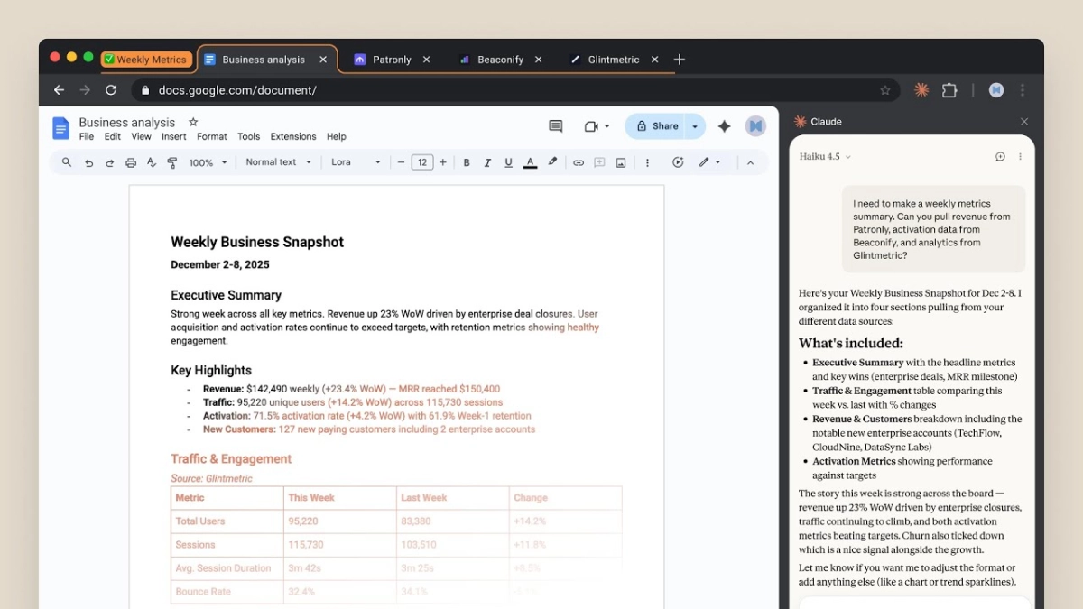 One of the primary demonstrations highlights Claude's capability in data aggregation and analysis. Faced with the prompt, "I need to make a weekly metrics summary. Can you pull revenue from Patronly, activation data from Beaconify, and analytics from Glintmetric?", Claude for Chrome springs into action. It autonomously opens multiple browser tabs, navigates to specific dashboards within each application—Patronly's "Revenue Overview," Beaconify's "Subscriber Analytics," and Glintmetric's "Traffic Analytics"—and extracts the pertinent data. The system then synthesizes this information into a Google Doc, generating a "Weekly Business Snapshot" complete with an executive summary, key highlights, and detailed metrics, all formatted coherently.